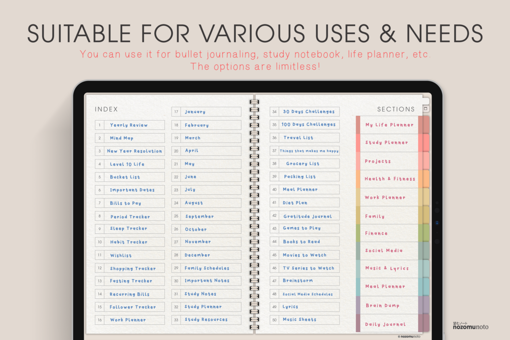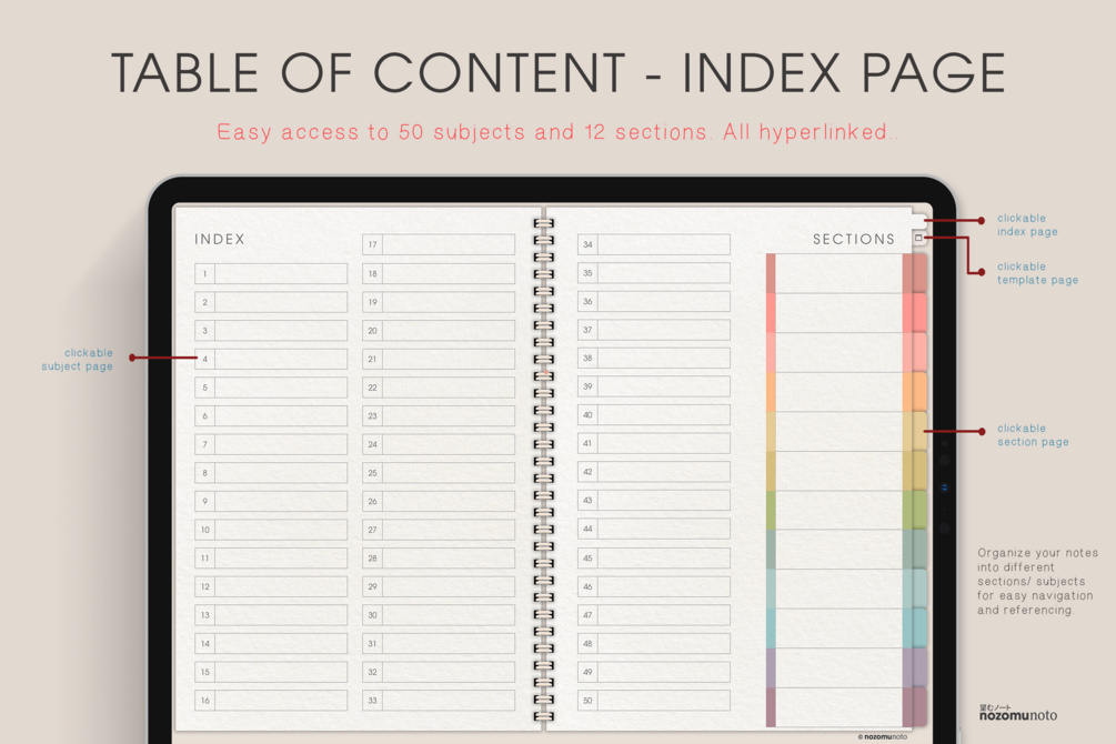 Organize your notes and plan you life with our Landscape Digital Notebook - 50 Subjects and 12 Sections! Whether you use GoodNotes, Notability, or any other PDF annotation app, this notebook is specifically designed for use with your iPad or tablet. All sections, subjects, templates are fully hyperlinked for easy navigation and access. The provided paper templates and other essential templates make this digital notebook perfect for any needs and situations!